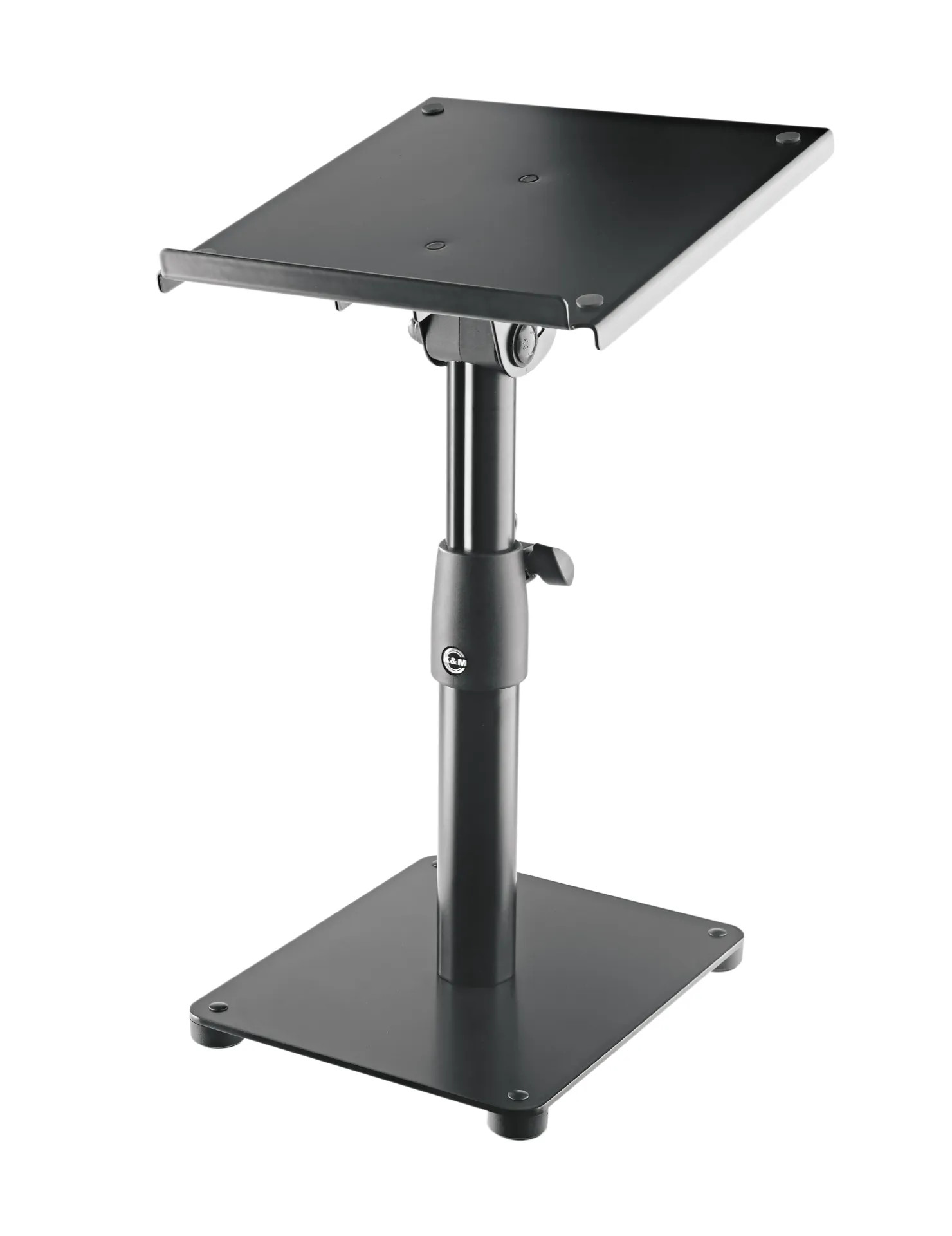 Höj och sänkbart samt vinklingsbart monitorstativ för bordsplacering. Den solida metallkonstruktionen med sin stora support platta (230 x 250 mm) passar ett brett utbud av studiomonitorer och annan utrustning med liknande storlek. Plattan kan steglöst vinklas upp 12,5 grader. Höjden kan justeras i fyra olika nivåer mellan 35 och 45cm. Den robusta konstruktionen tillåter en maxvikt av 25kg. Gummi pads ingår för att vibrationsdämpa stativet. Pris per styck.